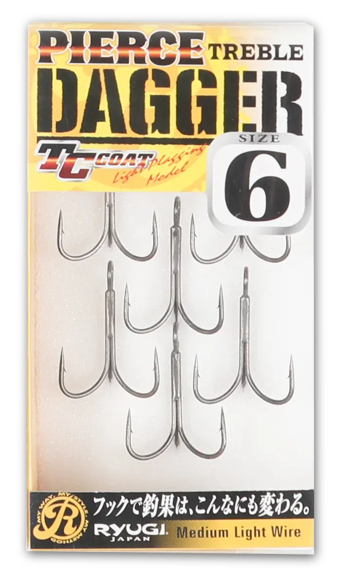 The hook point setting is derived from experience. Made from a special steel material with excellent wear  resistance. The shape is based on RYUGI's rigidity theory. The TC coating delivers unparalleled penetration  power. While retaining the performance of the Pias Treble, this model has been downsized to accommodate  light plugging.  This is the Pias Treble Dagger.